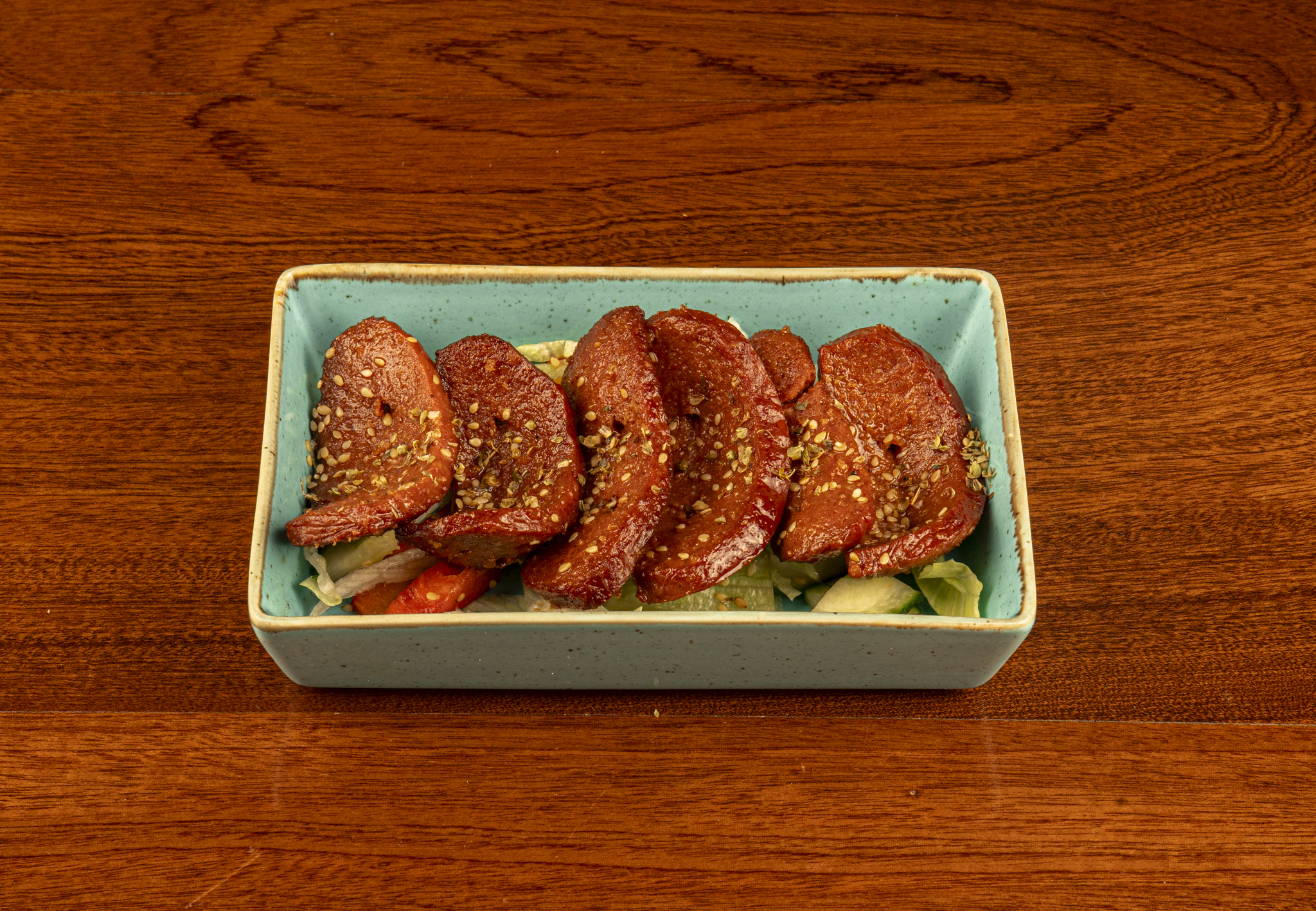 Grilled beef garlic sausages, served with salad