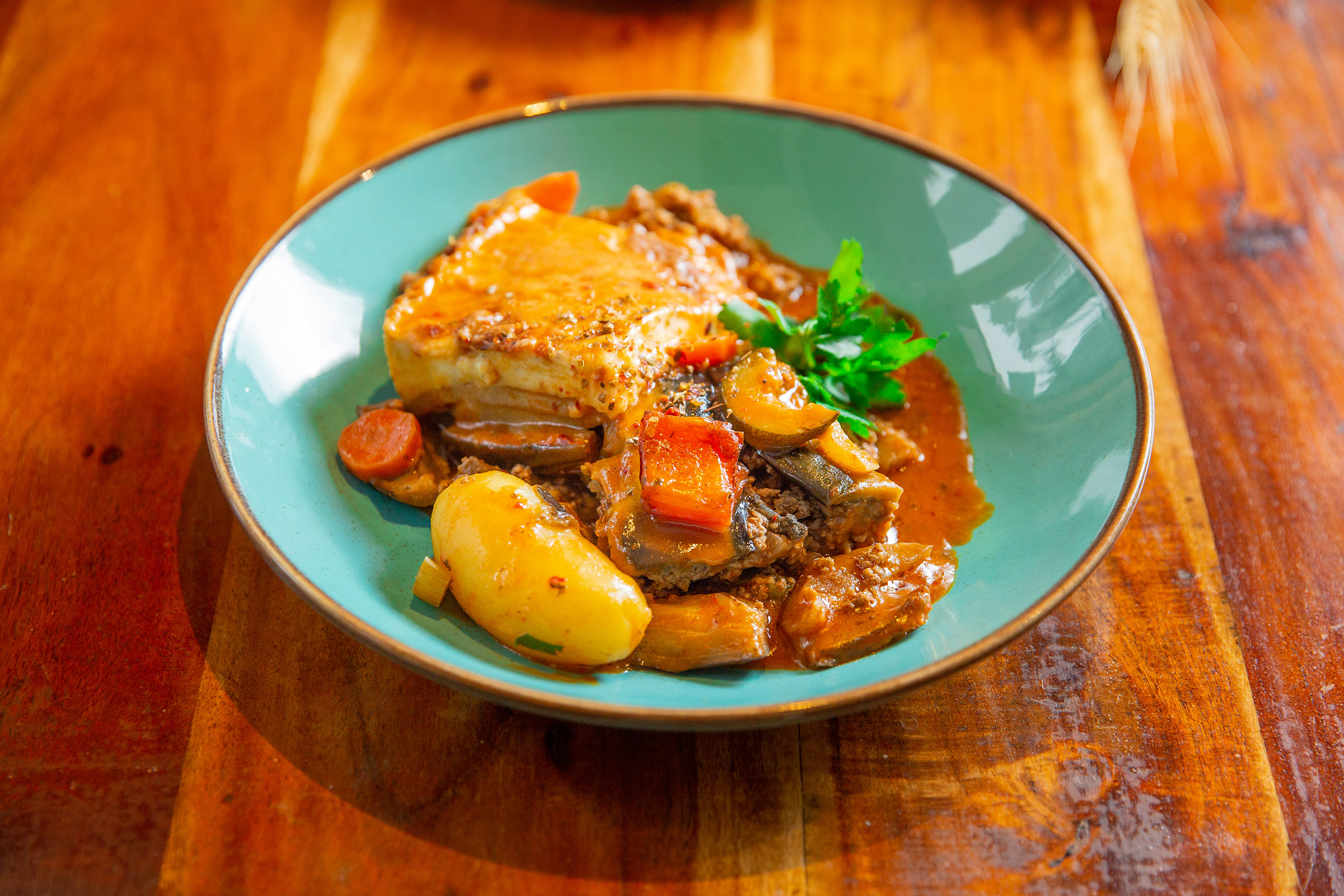 Layers of aubergines, potatoes, carrots, onions, fresh tomatoes, topped with béchamel sauce