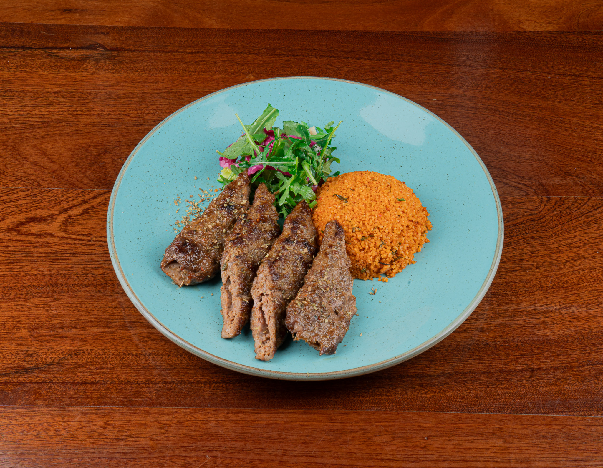 Grilled minced lamb patties, served with bulgur wheat and salad