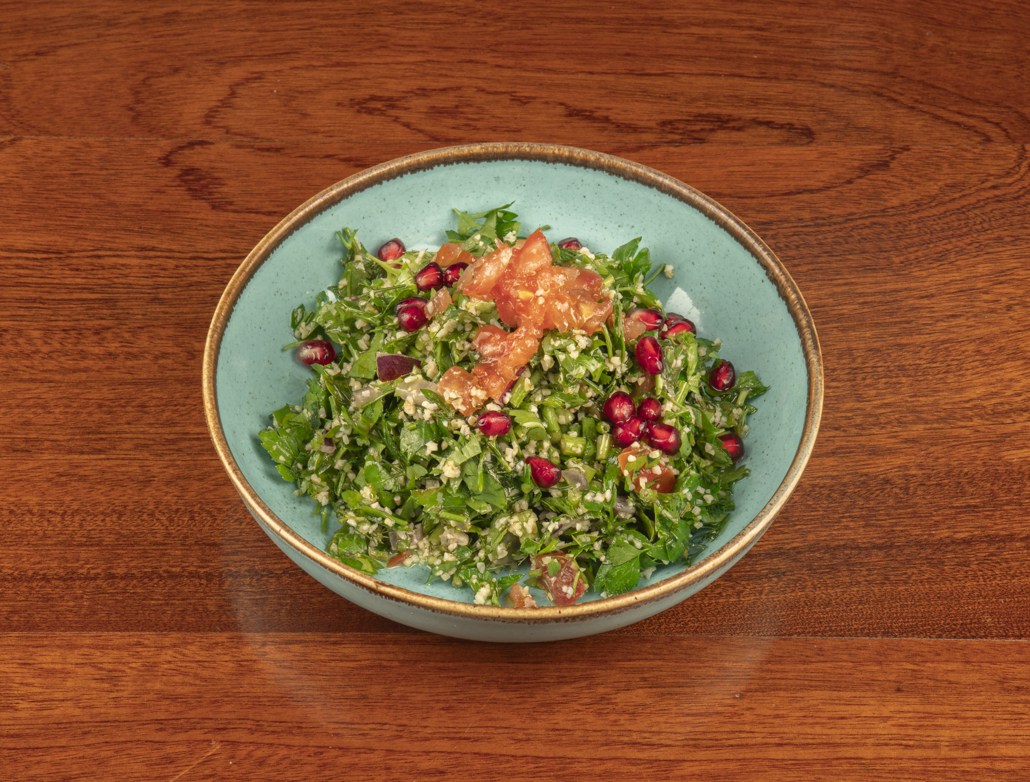 Chopped parsley salad of tomatoes, onions, cracked wheat, olive oil, lemon juice and pomegranate sauce
