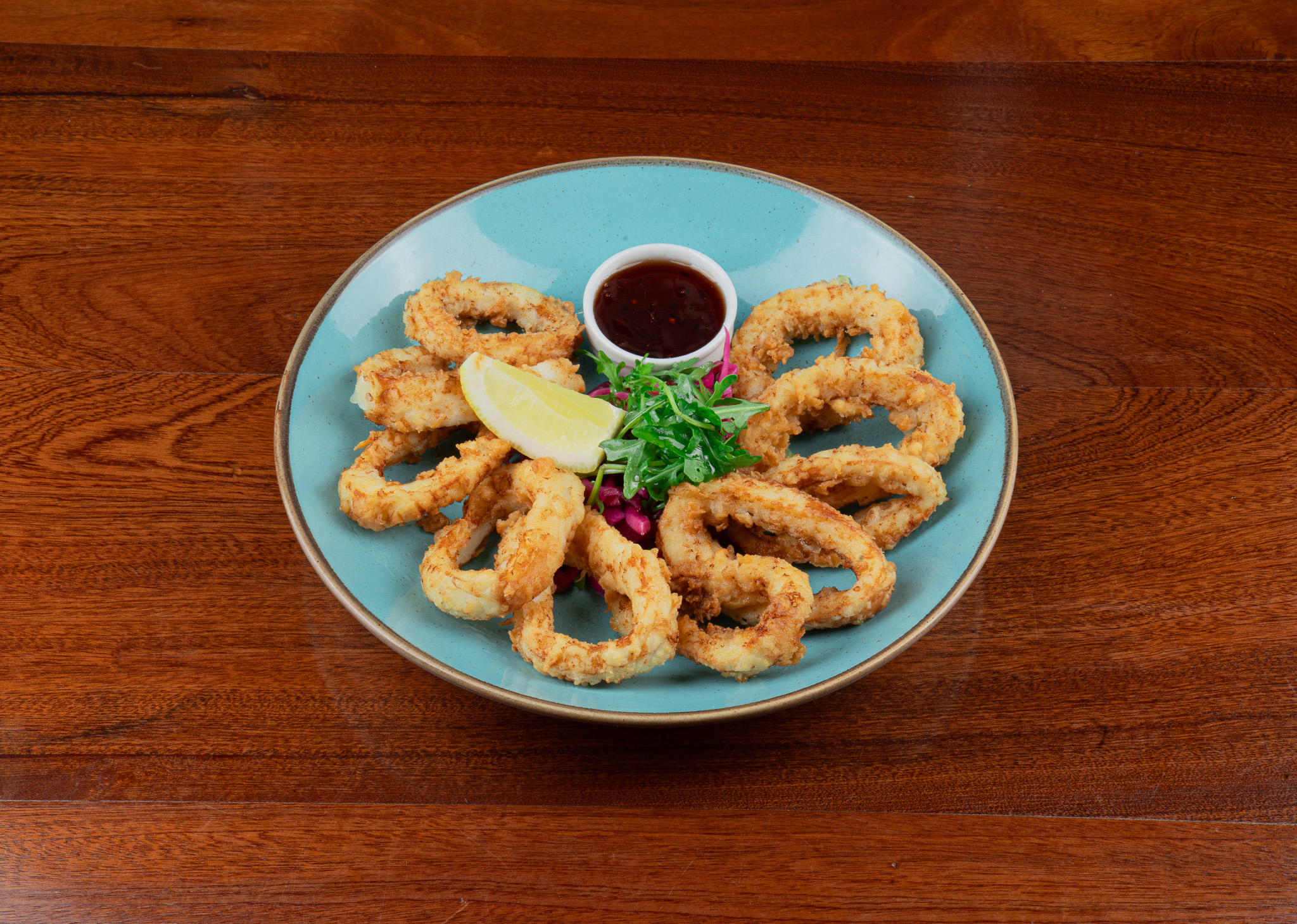 Deep fried squids, served with mixed salad, garlic sauces and sweet-sour sauce