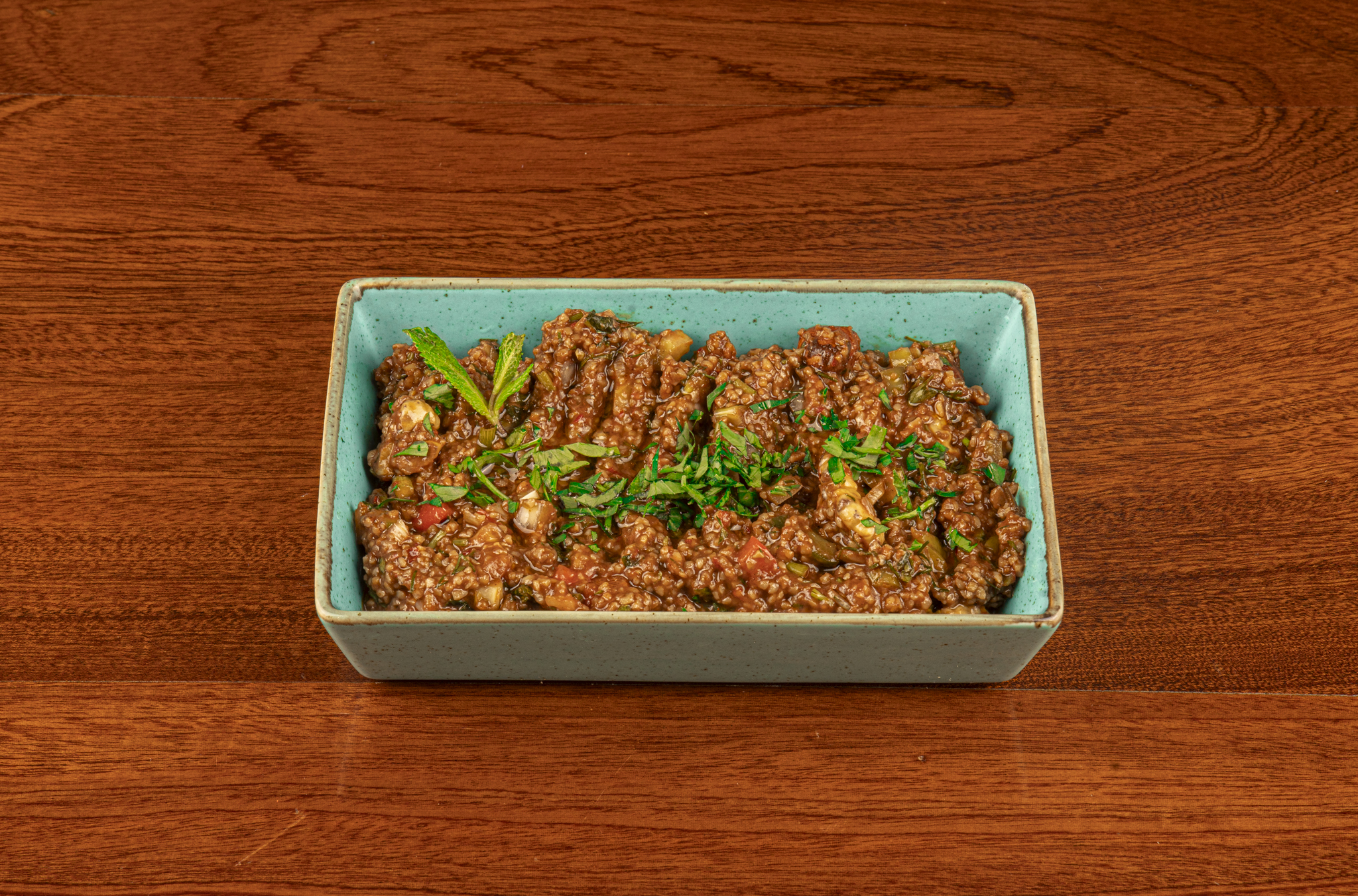 Bulgur wheat mixed with crushed walnuts and hazelnuts, spring onions and tomato sauce