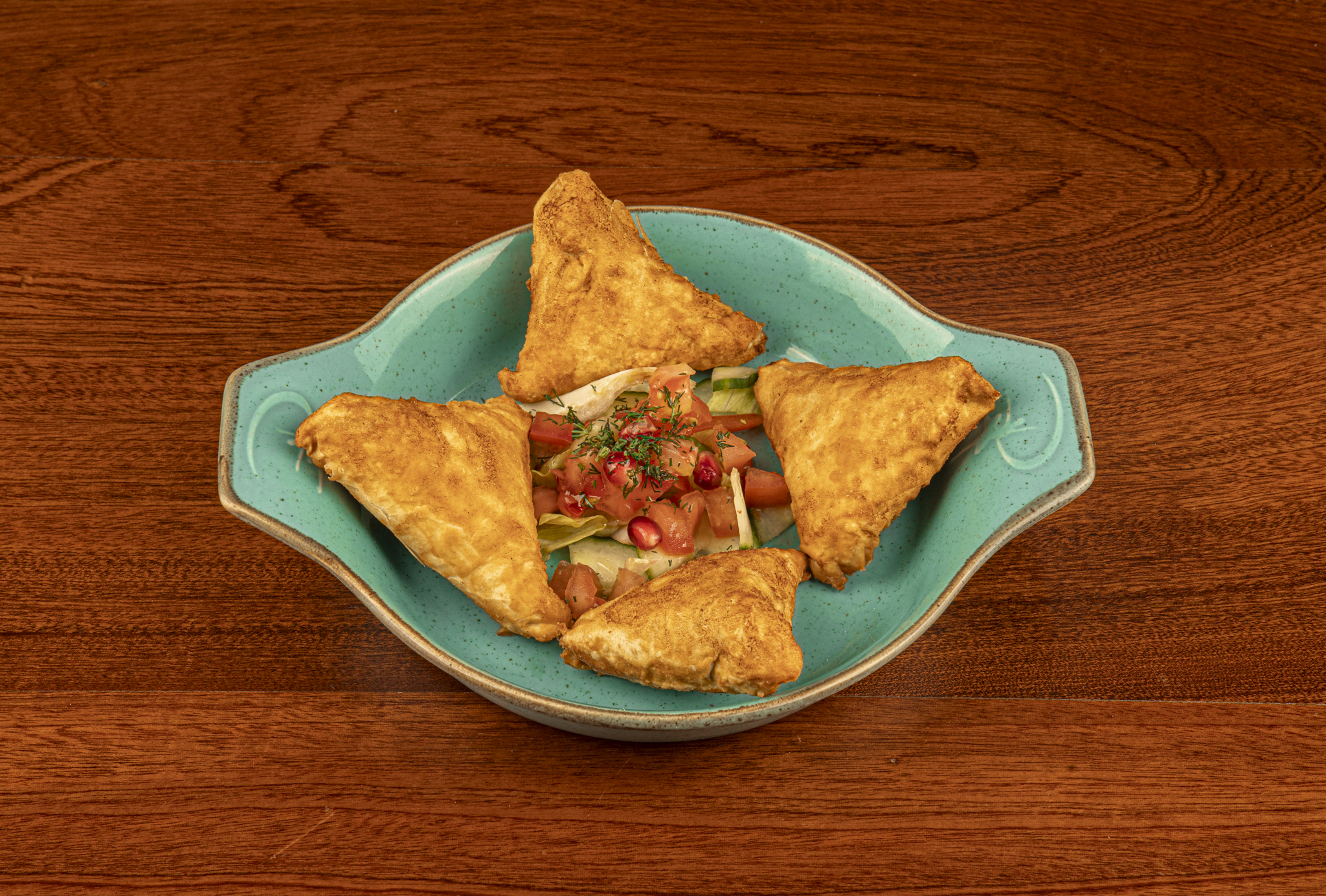 Filo pastry triangles stuffed with feta cheese and spinach, served with salad