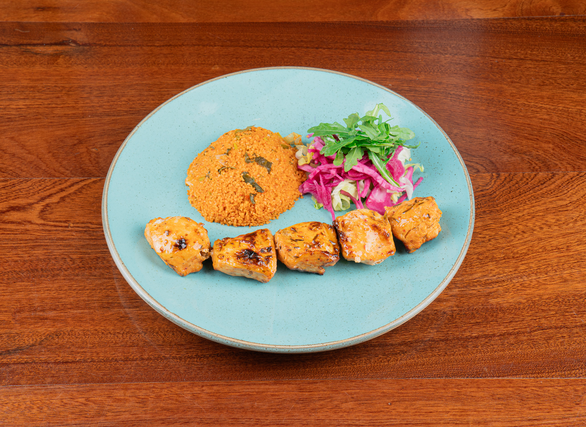Grilled skewers of marinated chicken cubes, served with bulgur wheat and salad