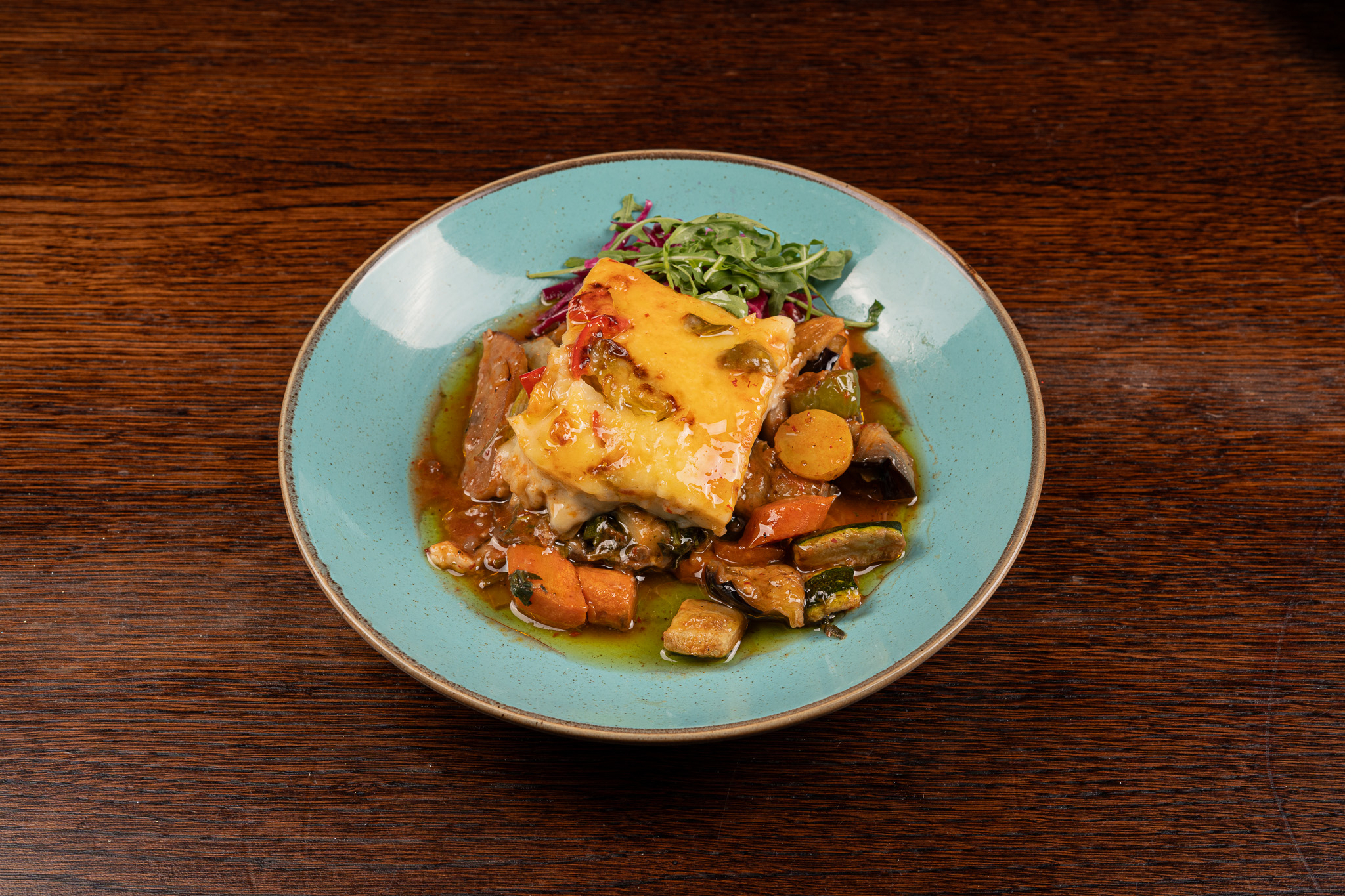 Layers of minced lamb, aubergines, potatoes and peppers topped with béchamel sauce